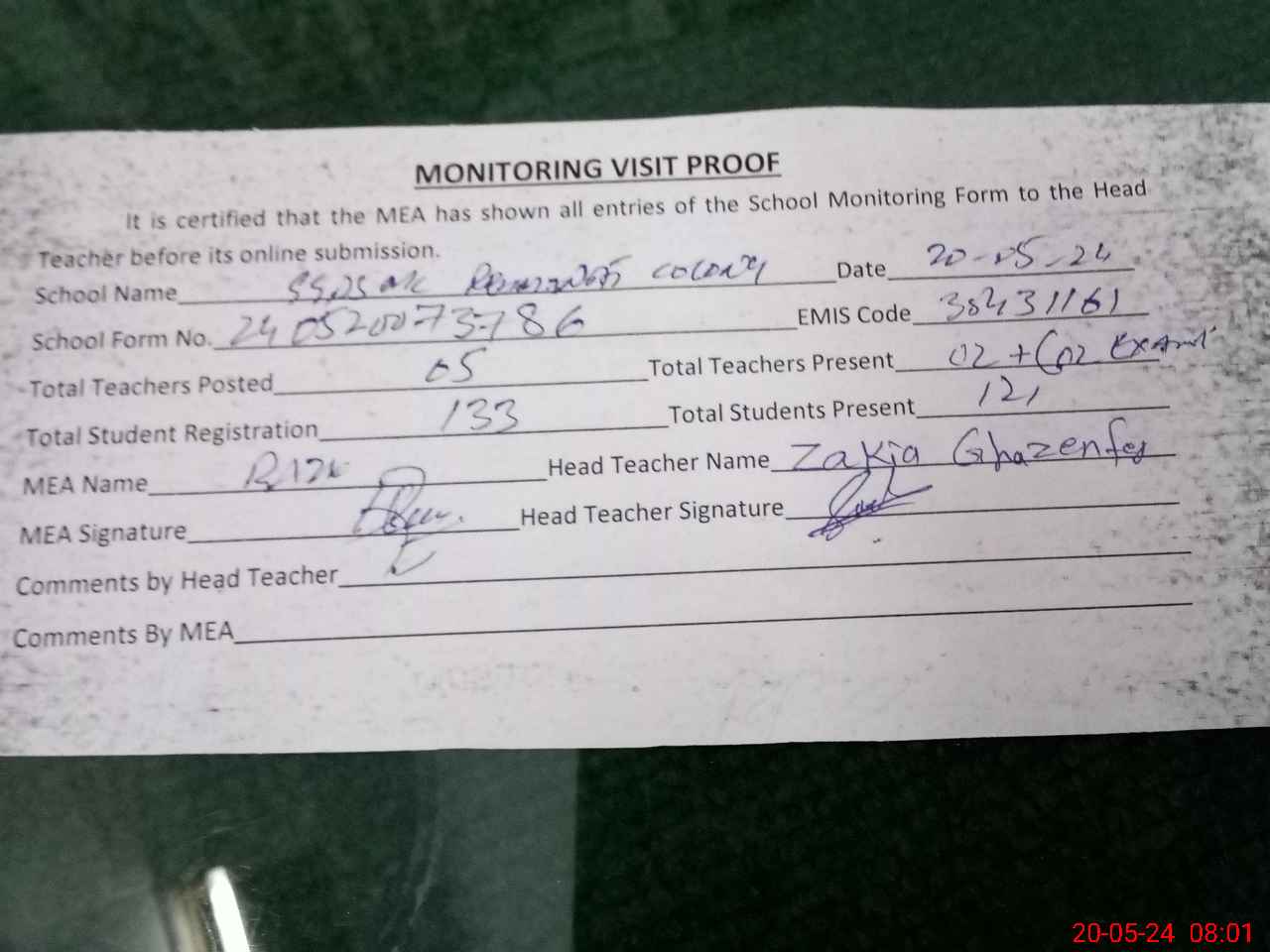 | Attendance Register | Head Teacher | MEA with School | Visit Proof |