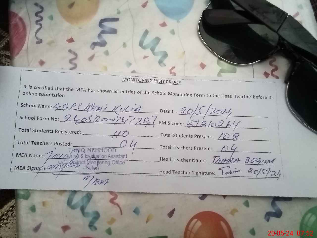 | Attendance Register | Head Teacher | MEA with School | Visit Proof |
