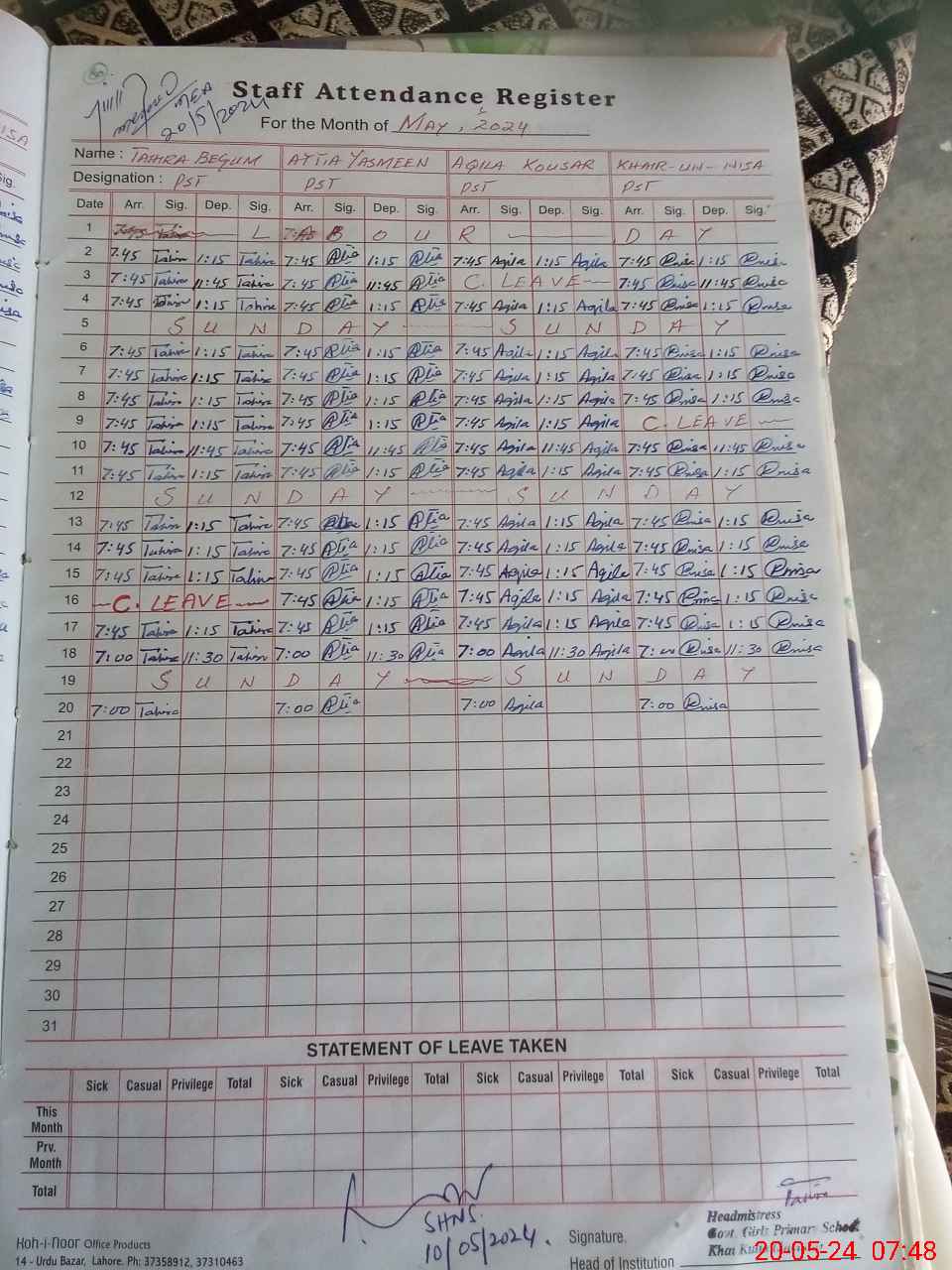 | Leave | Duty | Absent | Maternity | Medical | Ex- Pak |