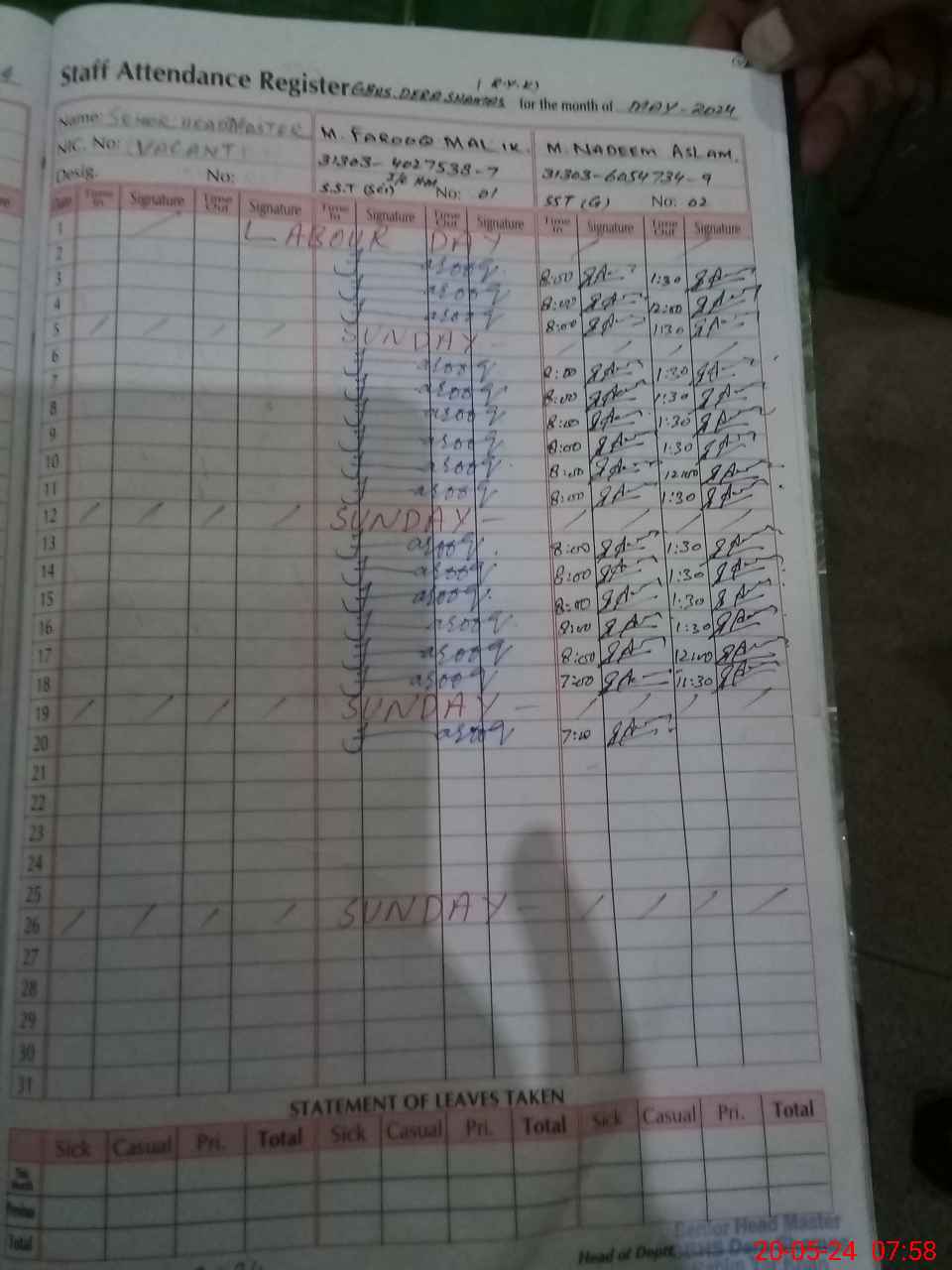 | CNIC | Full Name | Designation | R/C | Absence During Last Calender Month |