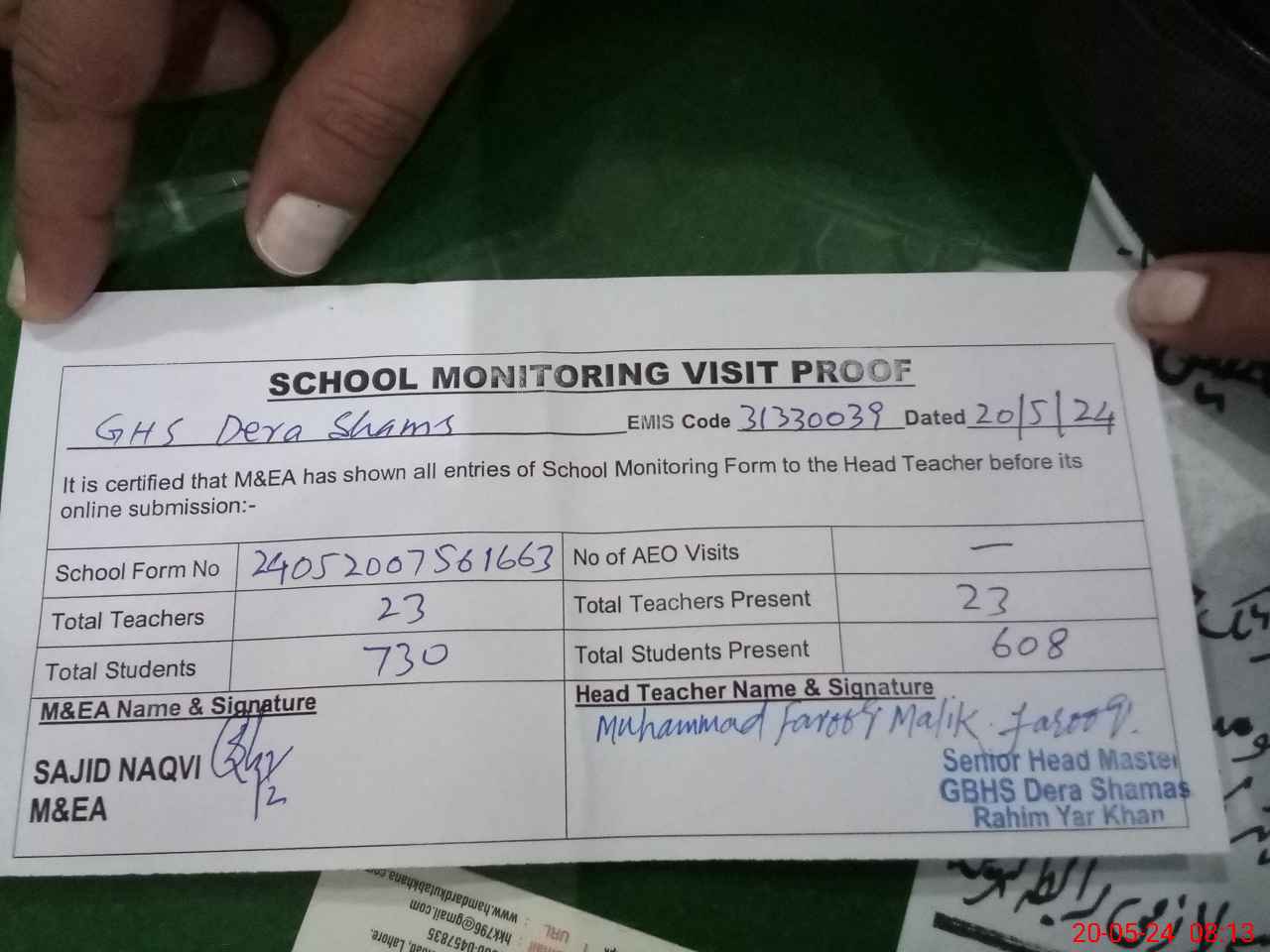 | Attendance Register | Head Teacher | MEA with School | Visit Proof |