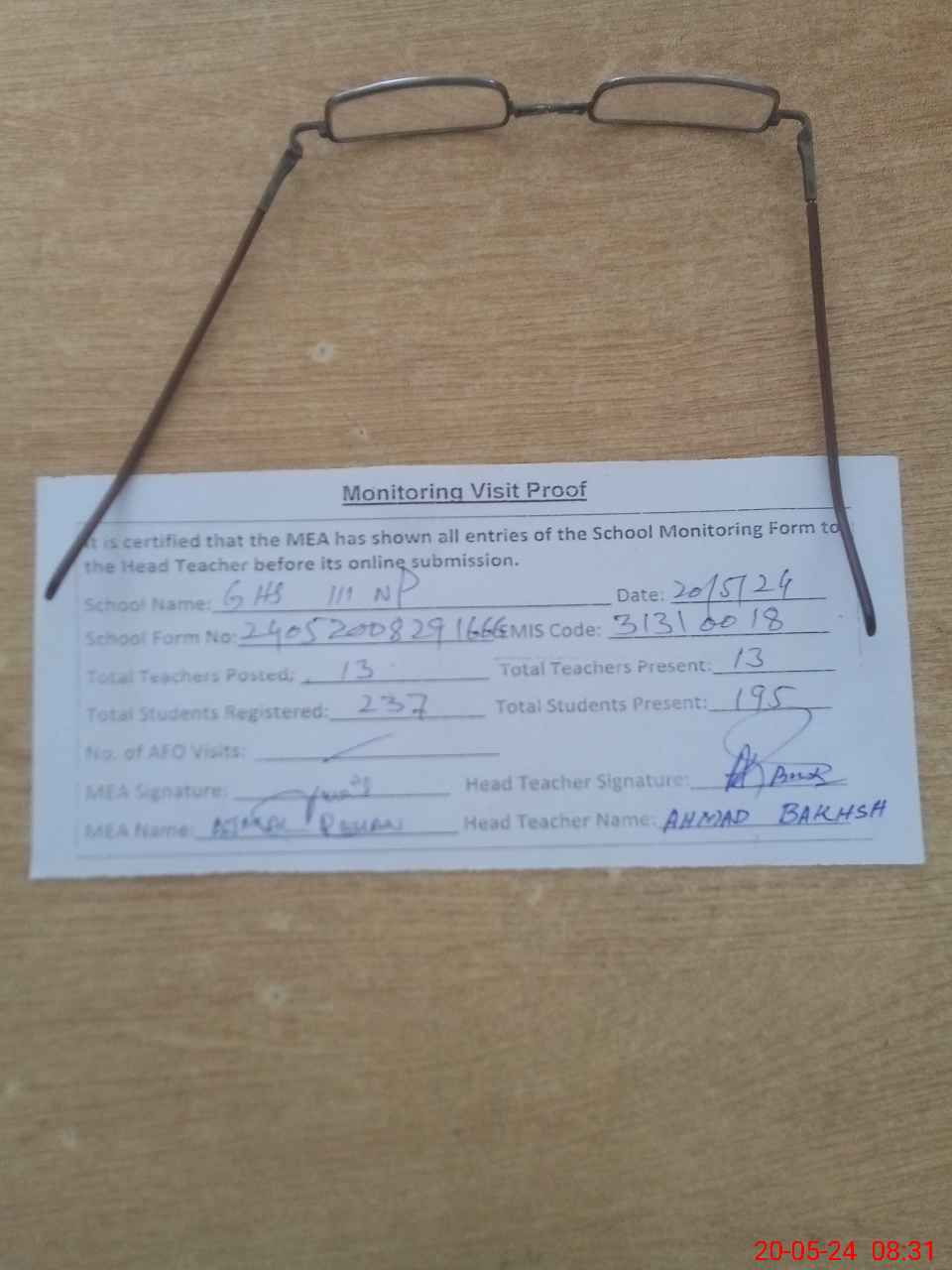 | Attendance Register | Head Teacher | MEA with School | Visit Proof |