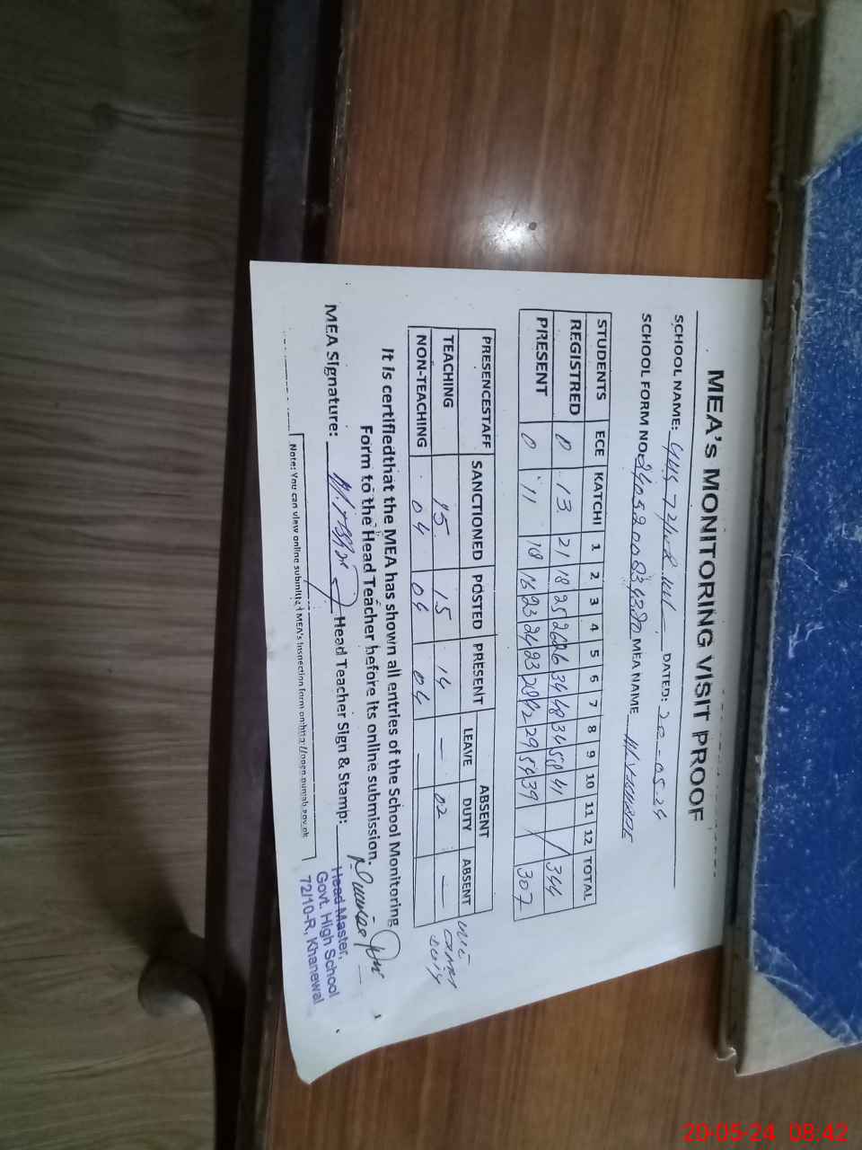 | Attendance Register | Head Teacher | MEA with School | Visit Proof |