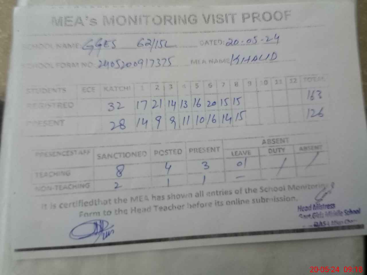| Attendance Register | Head Teacher | MEA with School | Visit Proof |