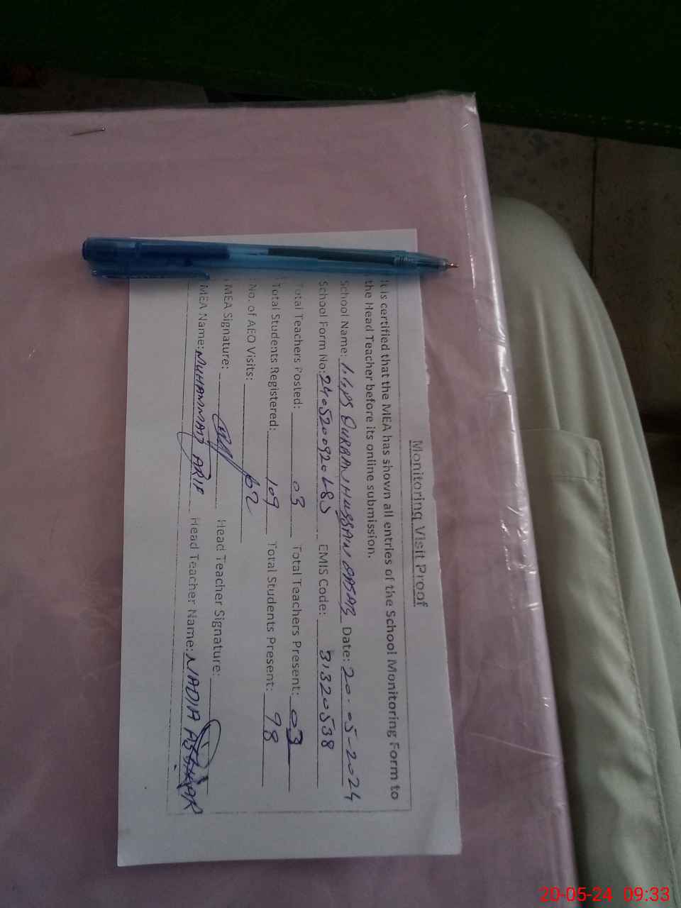 | Attendance Register | Head Teacher | MEA with School | Visit Proof |