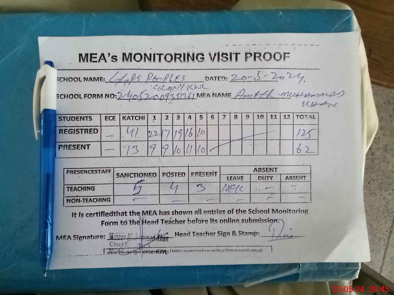 | Attendance Register | Head Teacher | MEA with School | Visit Proof |