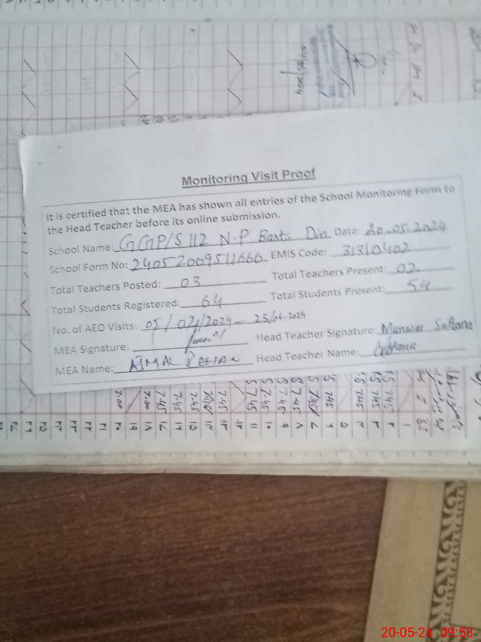 | Monitoring Date: 20-05-2024 | Start Time: 20-05-2024 09:38 AM | End Time: 20-05-2024 09:54 AM | Name of MEA: Mu**** Aj**** | |