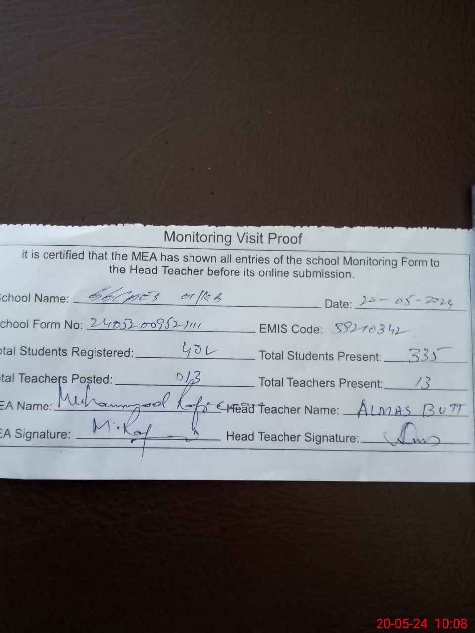 | Certified that this School was Inspected by the Undersigned MEA/DMO Today and the Information Stated Above is as Per Record. | |||||