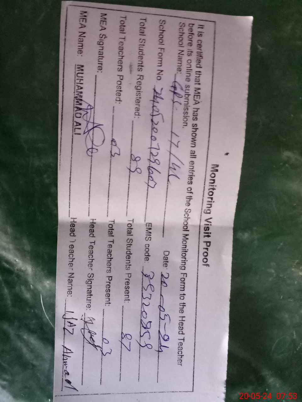 | Attendance Register | Head Teacher | MEA with School | Visit Proof |