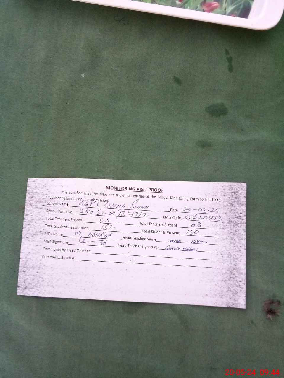 | Attendance Register | Head Teacher | MEA with School | Visit Proof |