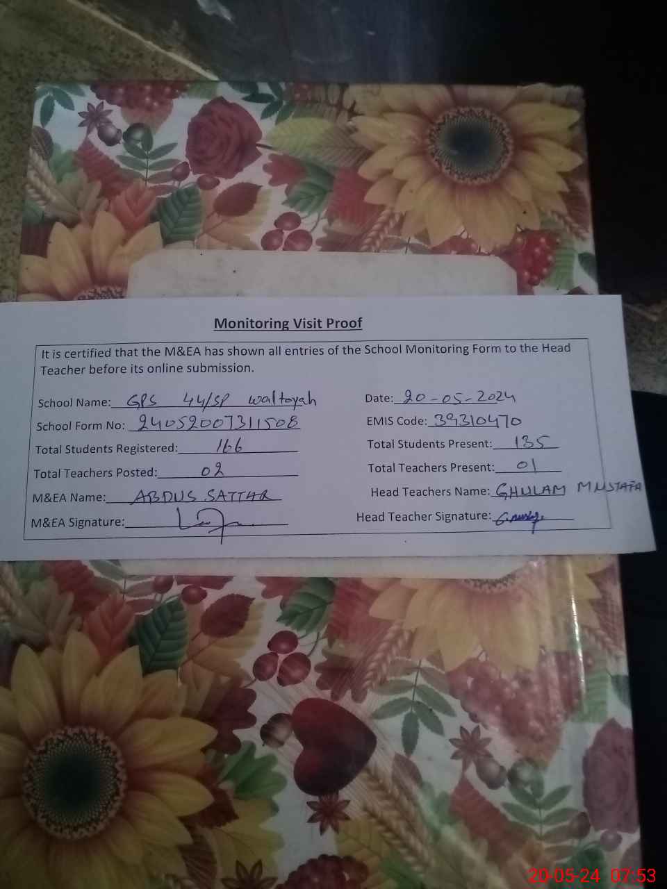 | Attendance Register | Head Teacher | MEA with School | Visit Proof |