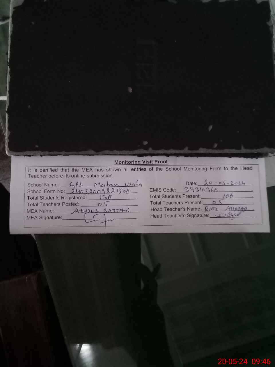 | Attendance Register | Head Teacher | MEA with School | Visit Proof |