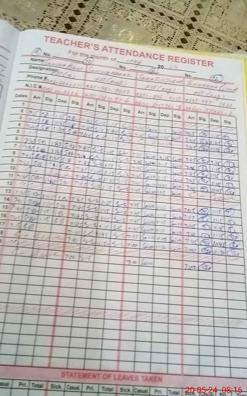 | CNIC | Full Name | Designation | R/C | Absence During Last Calender Month |