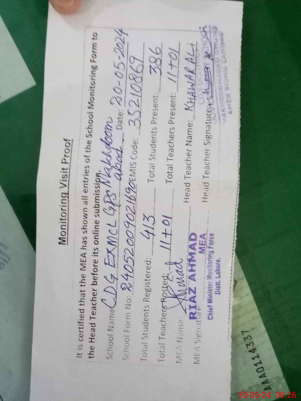 | Remarks (Use Separate Page if Required): Two schools gps Makhdoom Abad and GGES Jahangir park are conducting here both schools were being operated in separate shifts before the new notification of school timing as 0700 hrs to 1130 hrs Now both schools having same timing and shifts Due to this classes are overcrowded Some class rooms are without ventilation therefore are suffocated Class rooms floors are below the level of courtyard and out side street 04 teachers of this school are on exame duty Out of 413 students 386 are present and studying in 09 class rooms Out of 12 teachers 11 teachers are showing system Ghulam yaseen pst is temporarily attached here | |||||