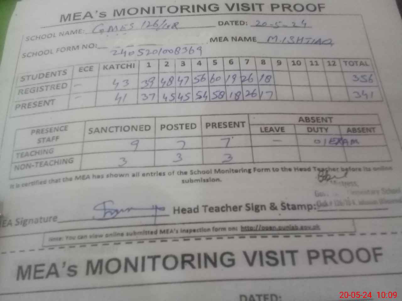 | Attendance Register | Head Teacher | MEA with School | Visit Proof |