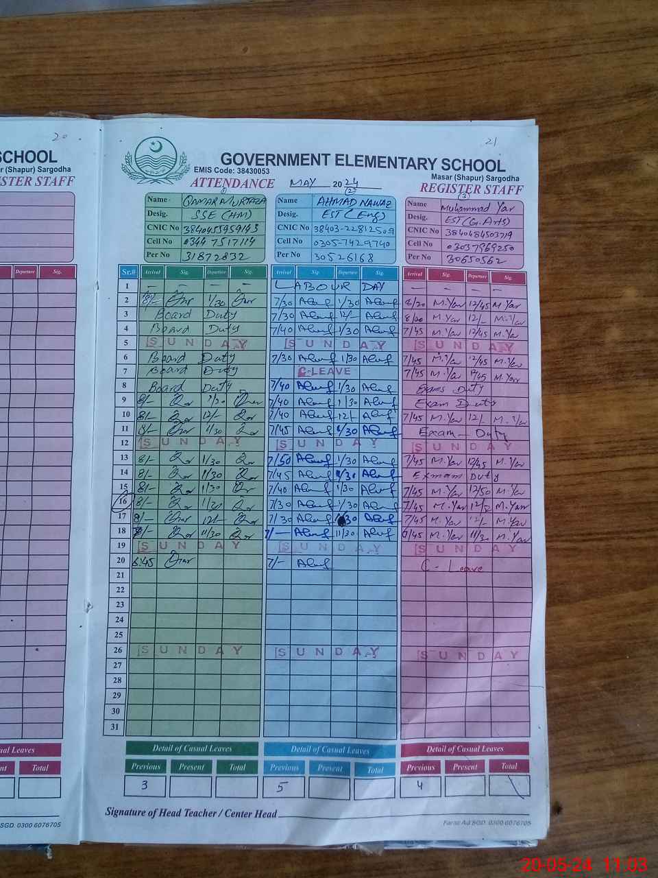 | CNIC | Full Name | Designation | R/C | Absence During Last Calender Month |