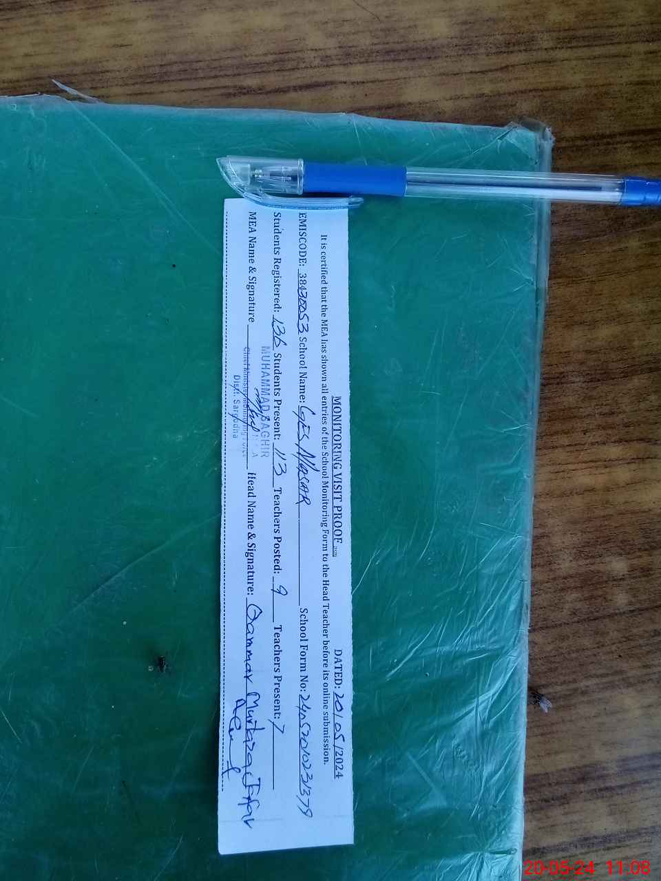 | Attendance Register | Head Teacher | MEA with School | Visit Proof |
