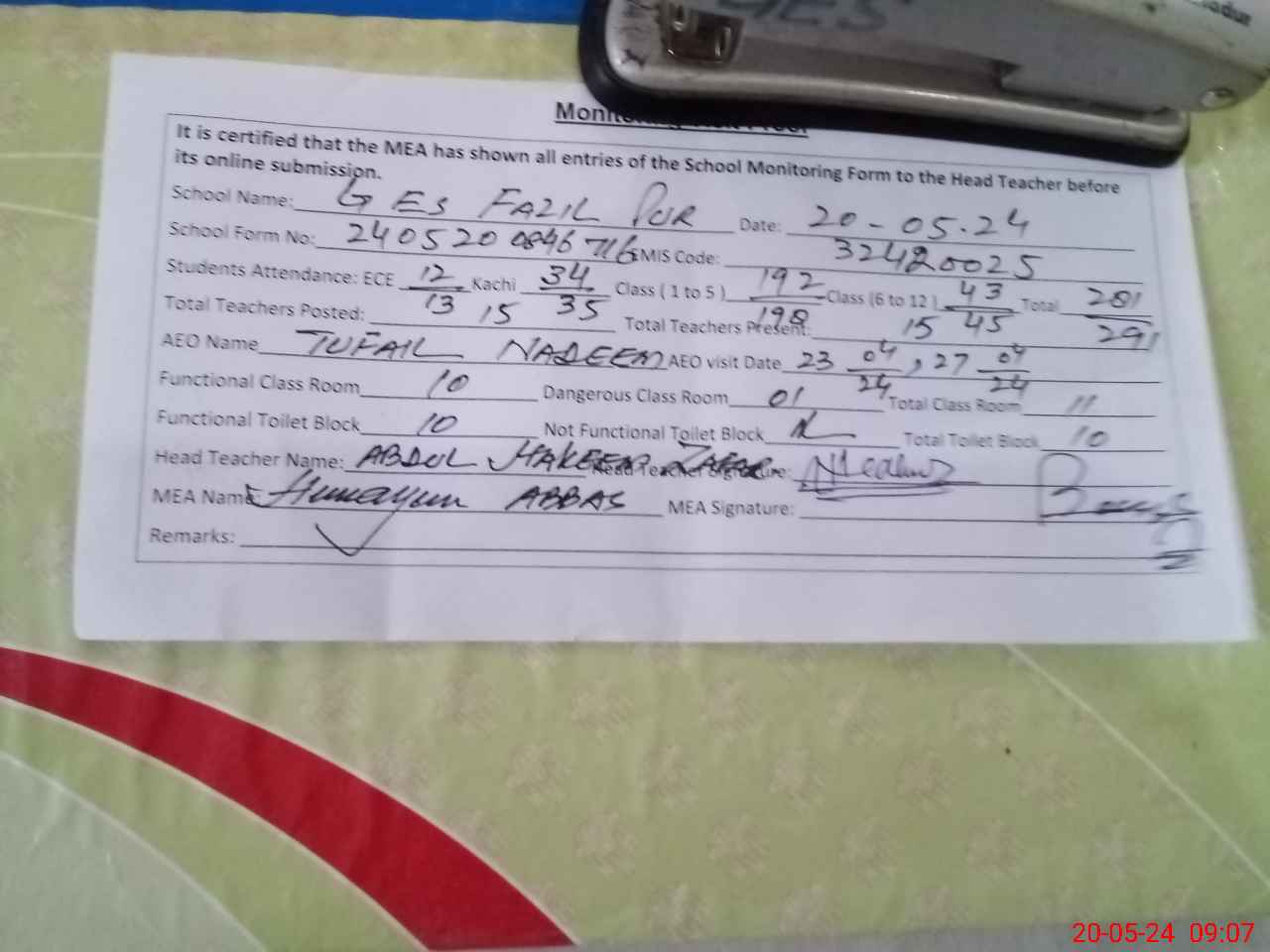| Certified that this School was Inspected by the Undersigned MEA/DMO Today and the Information Stated Above is as Per Record. | |||||