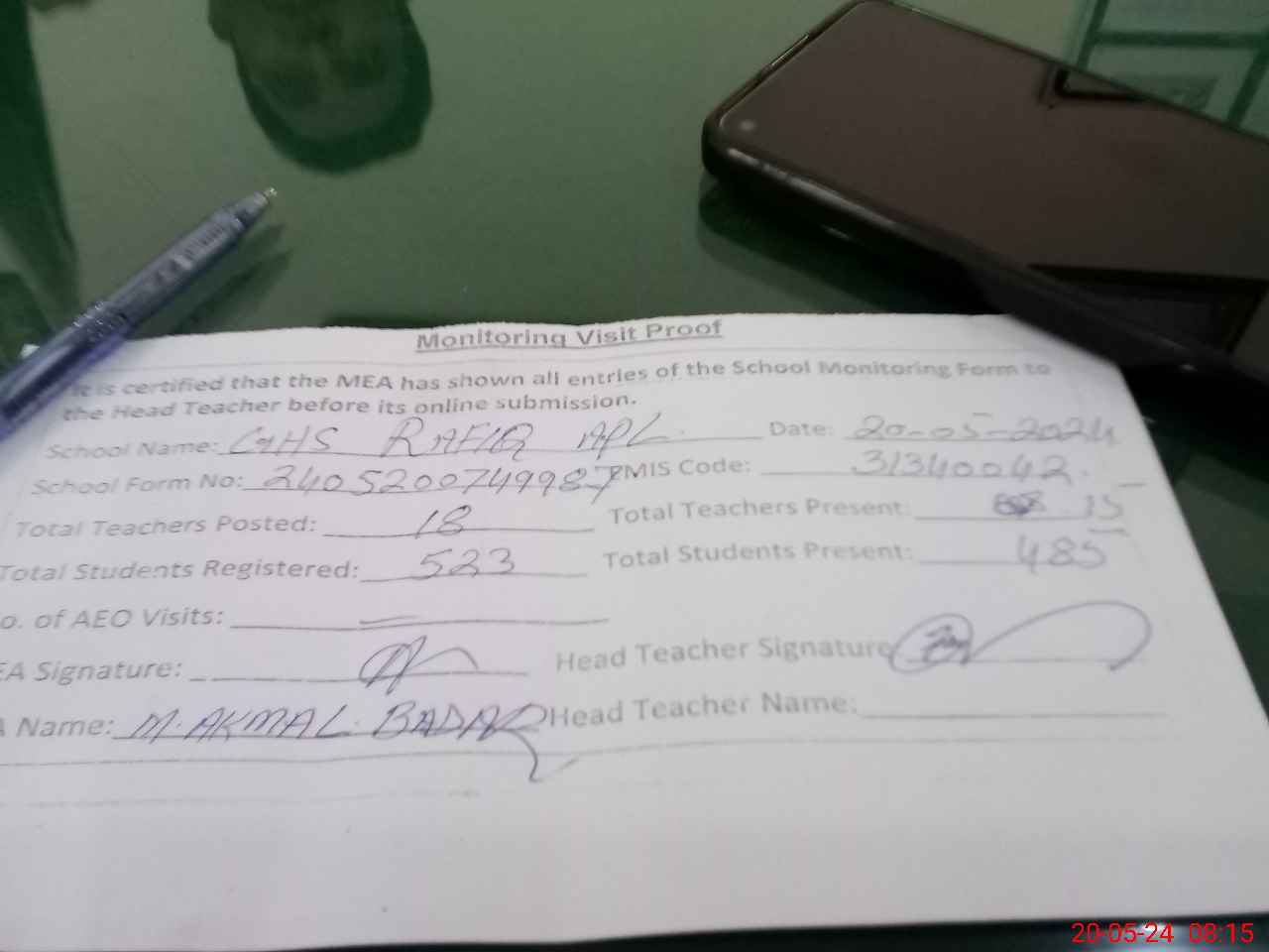 | Monitoring Date: 20-05-2024 | Start Time: 20-05-2024 07:49 AM | End Time: 20-05-2024 08:45 AM | Name of MEA: Mu**** Ak**** Ba**** | |