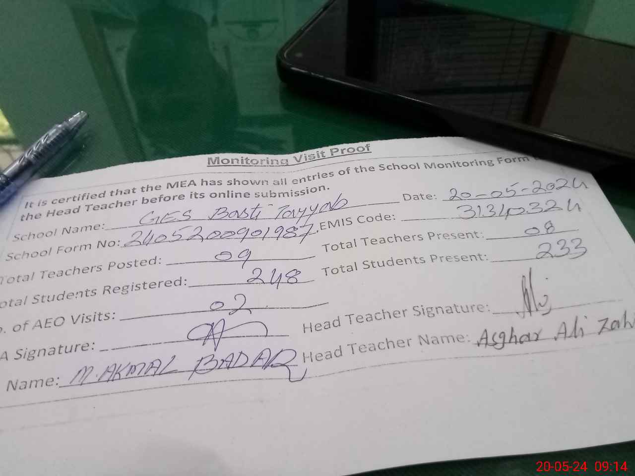 | Attendance Register | Head Teacher | MEA with School | Visit Proof |