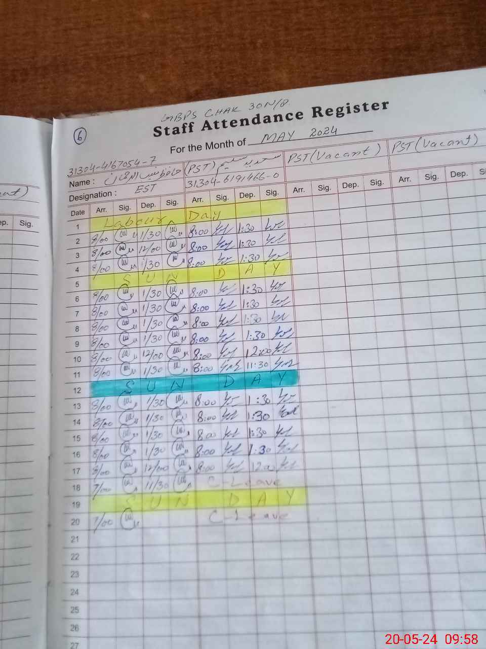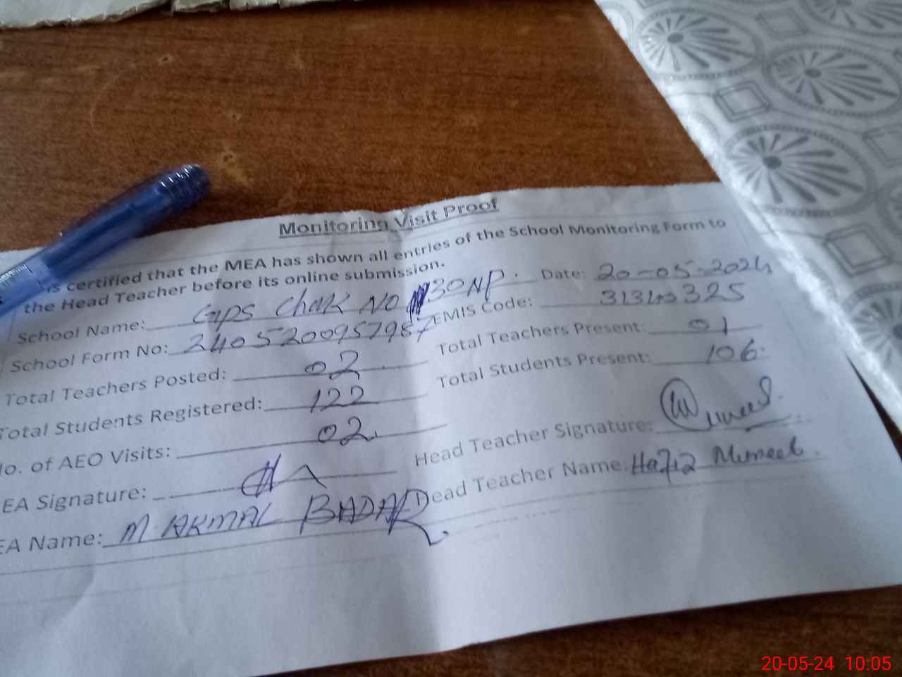 | Total no. of Classrooms: 7 No. of Classrooms Used for Teaching: 7 No. of Classrooms Storing Old Furniture, FTBs, etc: 0Comments if Any: Teacher saadia saleem is absent approved leave record not provided |