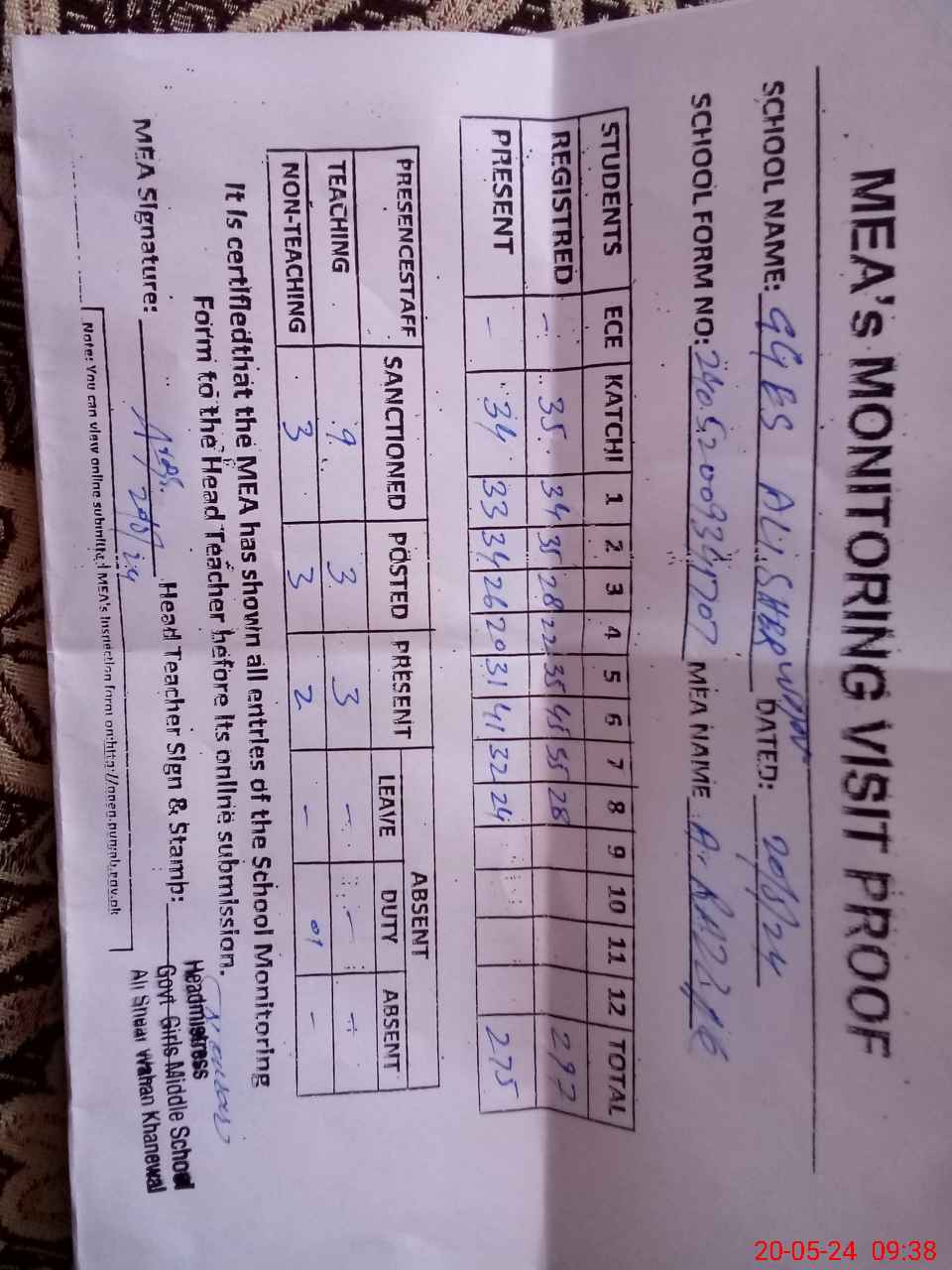 | Attendance Register | Head Teacher | MEA with School | Visit Proof |