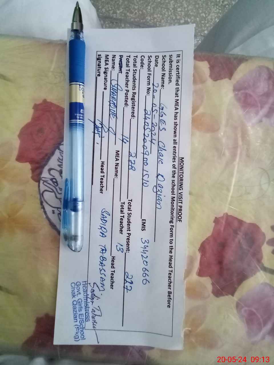 | Attendance Register | Head Teacher | MEA with School | Visit Proof |