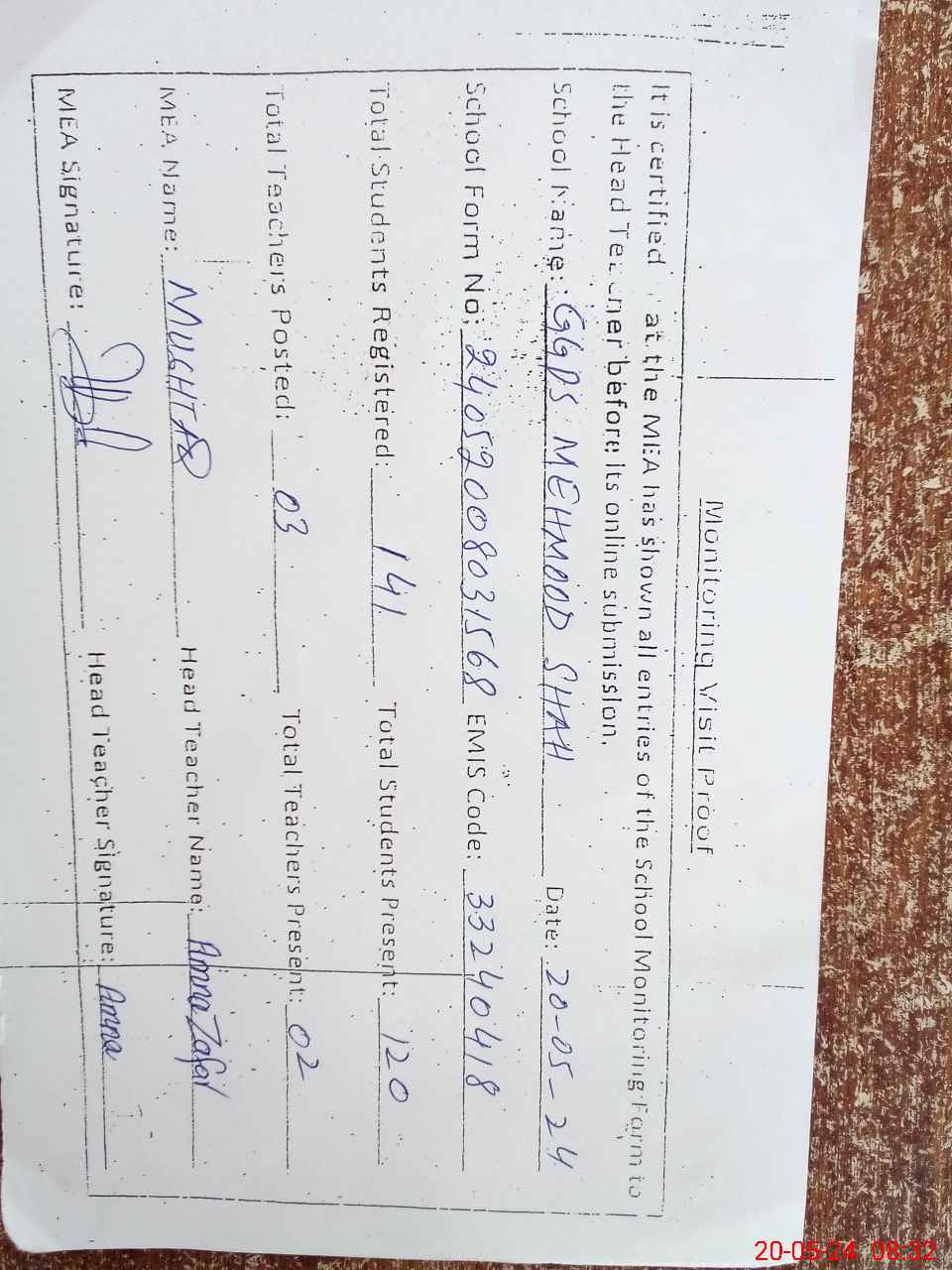 | Attendance Register | Head Teacher | MEA with School | Visit Proof |