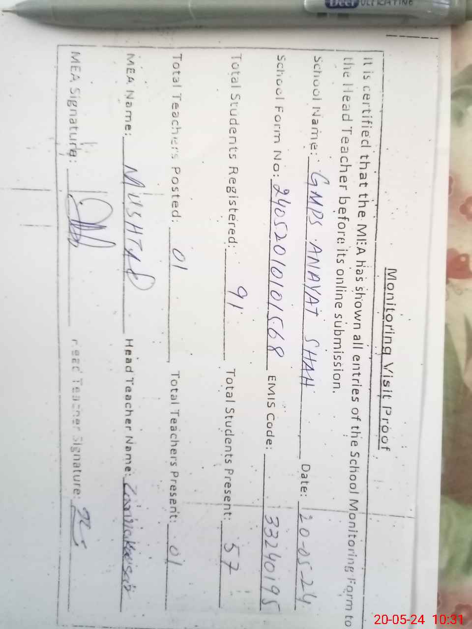 | EMIS Code: 33240195 | Name of School: GMPS ANAYAT SHAH | |||
