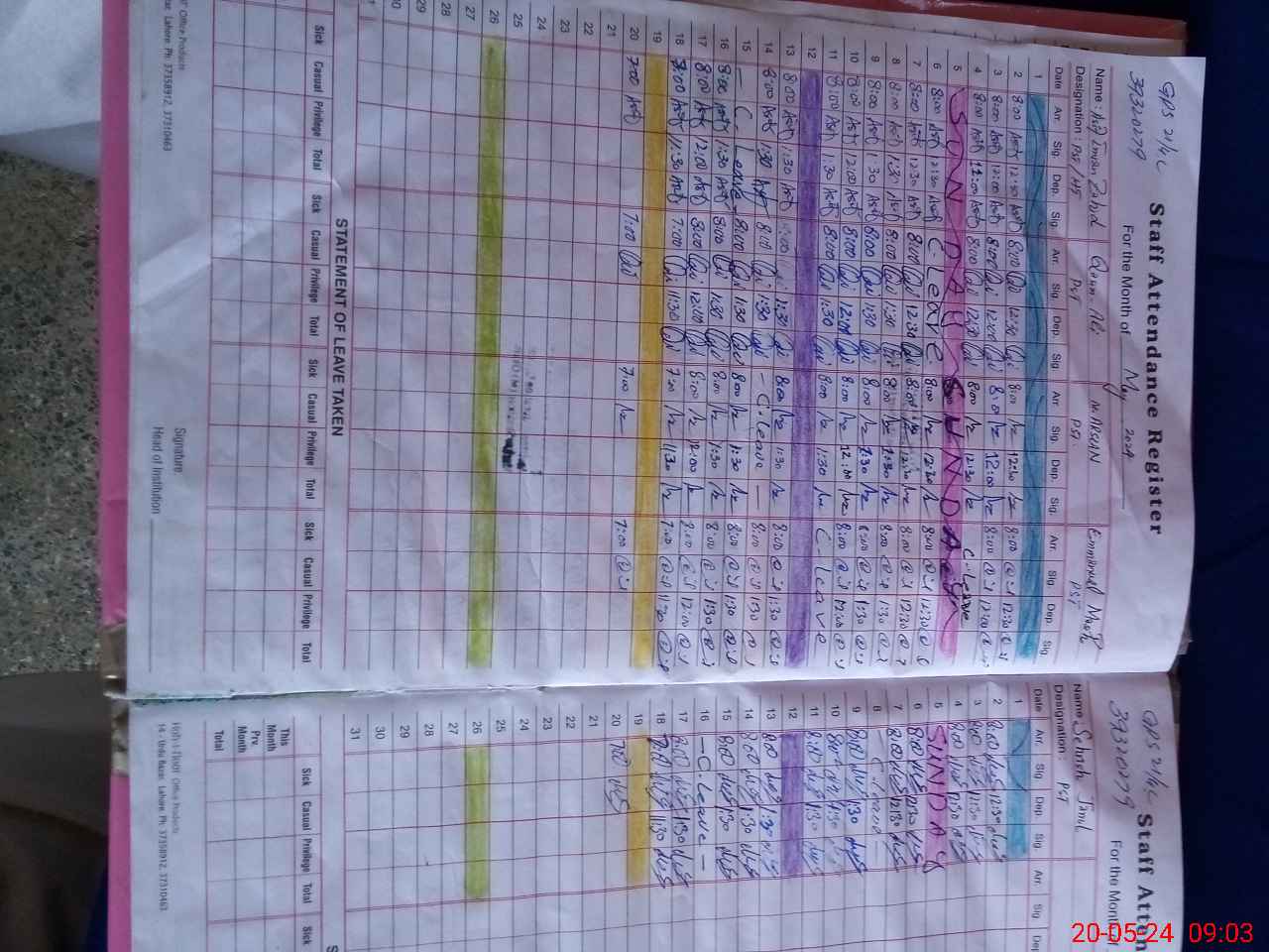 | CNIC | Full Name | Designation | R/C | Absence During Last Calender Month |