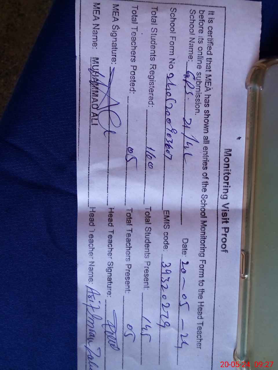| Name: As**** Im**** Za**** Designation: (School Headmaster's/Headmistress's) PST Phone/Cell Number: 03**** |
