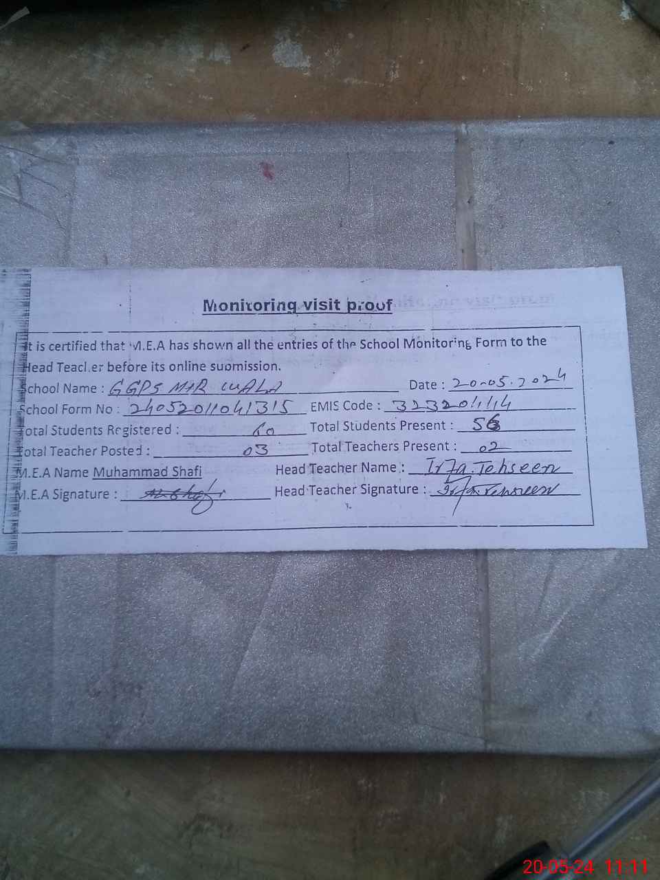| Attendance Register | Head Teacher | MEA with School | Visit Proof |
