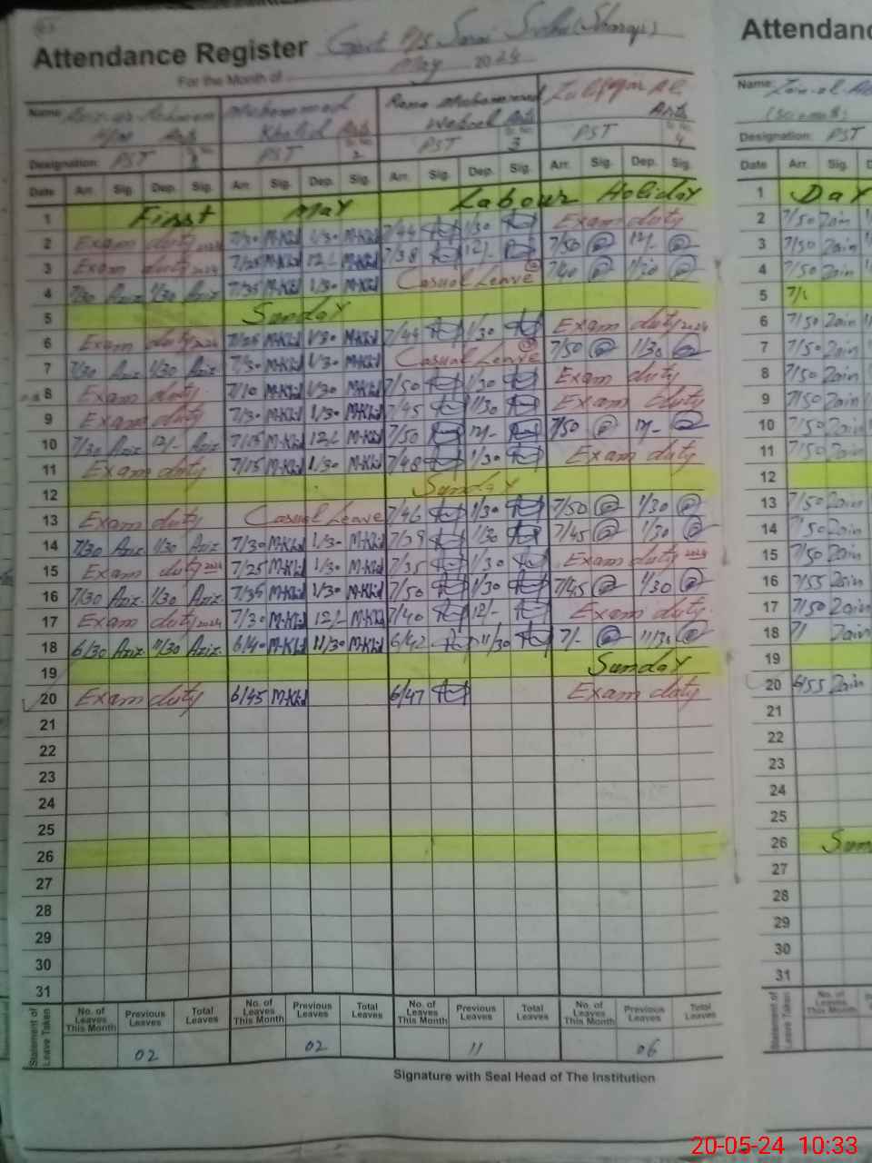 | 36**** | Az**** UrRe**** | PST | Regular | 0 | 0 | 0 | 0 | 0 | 0 | 0 | 0 | 0 | Exam Duty |