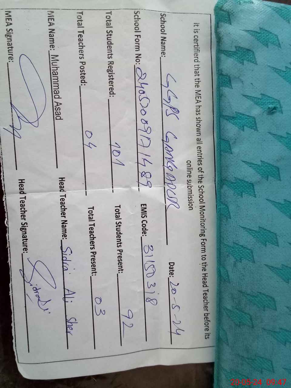 | Name: Si**** Al**** Sh**** Designation: (School Headmaster's/Headmistress's) PST Phone/Cell Number: 03**** |