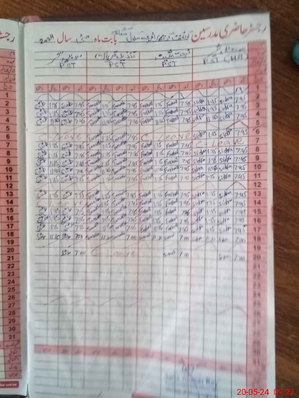 | CNIC | Full Name | Designation | R/C | Absence During Last Calender Month |