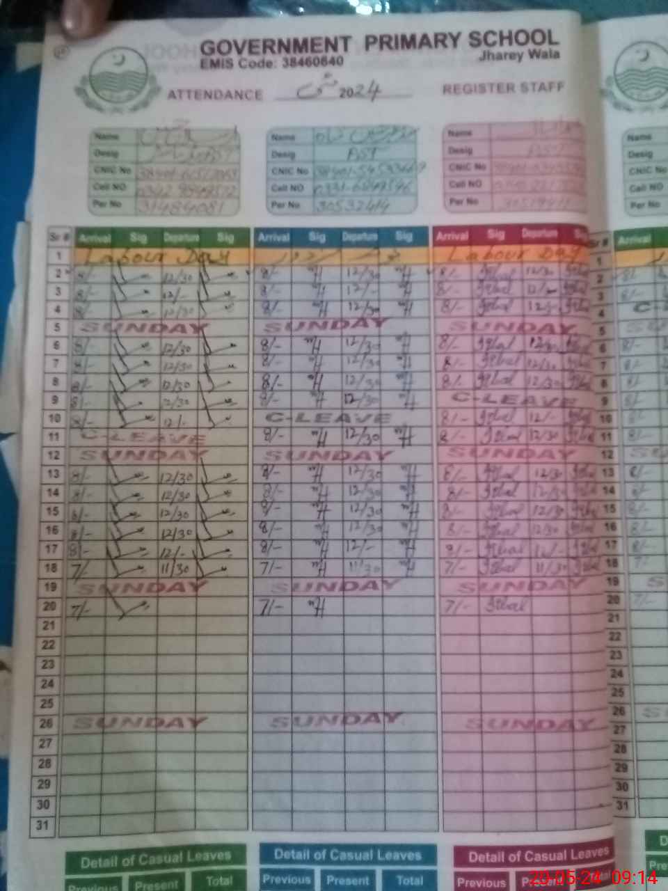 | CNIC | Full Name | Designation | R/C | Absence during last cal. month |