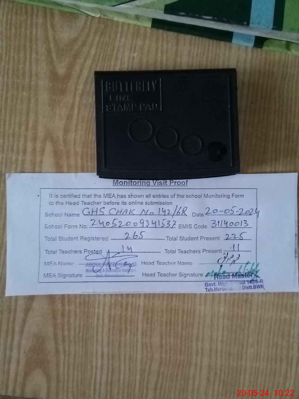 | EMIS Code: 31140013 | Name of School: GHS CHAK NO. 142/6-R | |||
