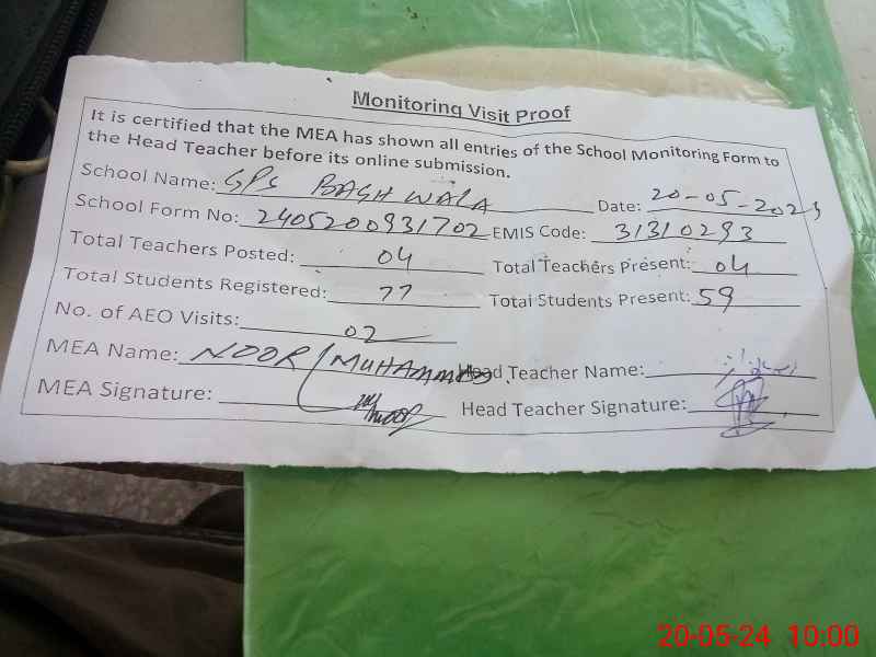 | EMIS Code: 31310293 | Name of School: GPS BAGH WALA | |||