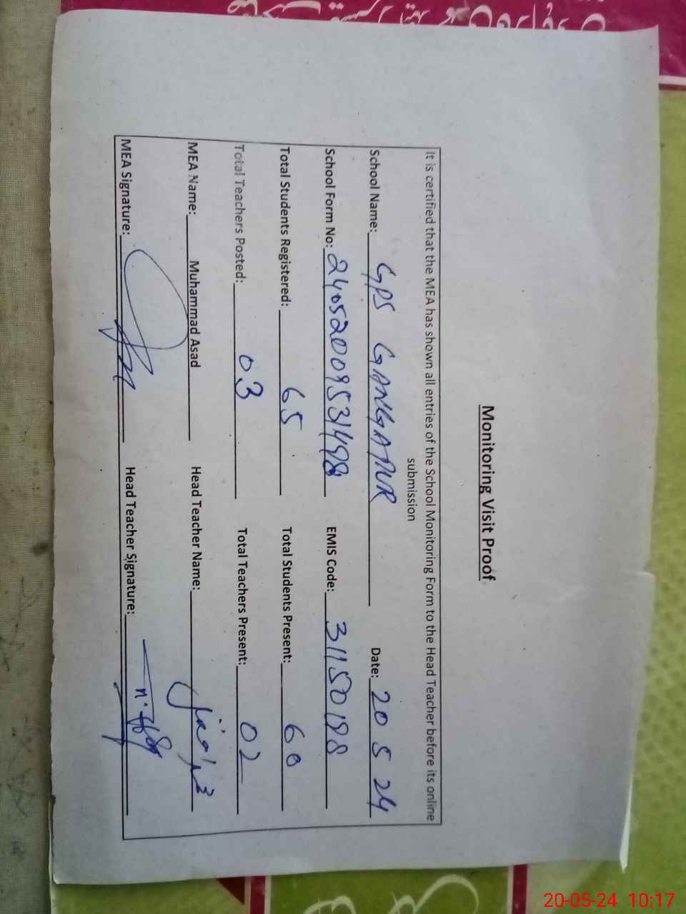 | Attendance Register | Head Teacher | MEA with School | Visit Proof |