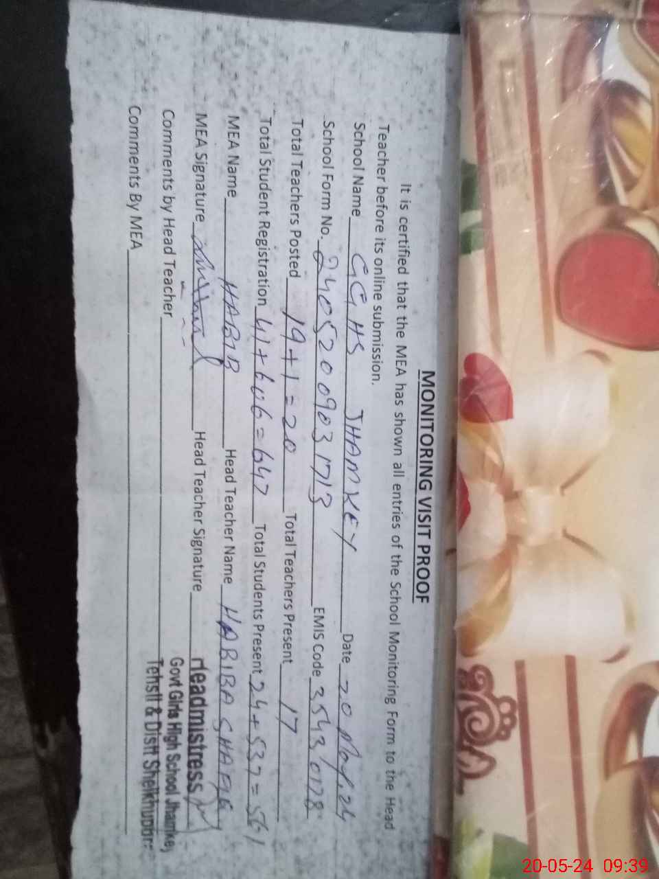 | Attendance Register | Head Teacher | MEA with School | Visit Proof |