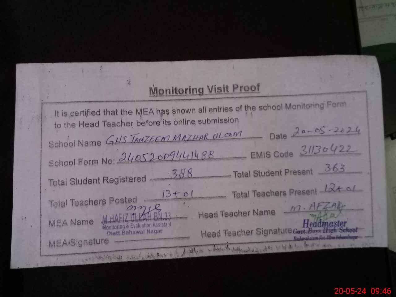 | EMIS Code: 31130422 | Name of School: GHS TANZEEM MAZHAR ULOOM FORT ABBAS | |||