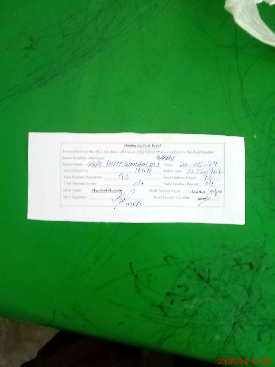 | Attendance Register | Head Teacher | MEA with School | Visit Proof |