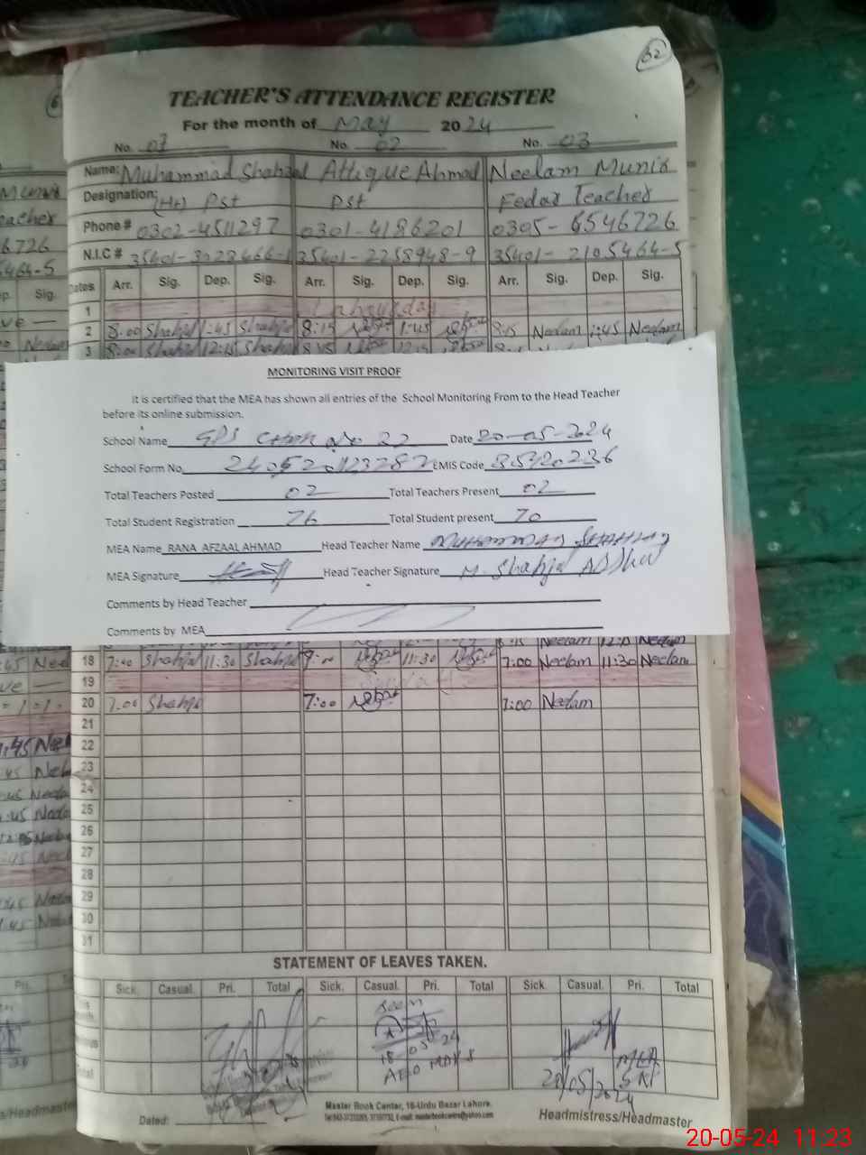 | Attendance Register | Head Teacher | MEA with School | Visit Proof |