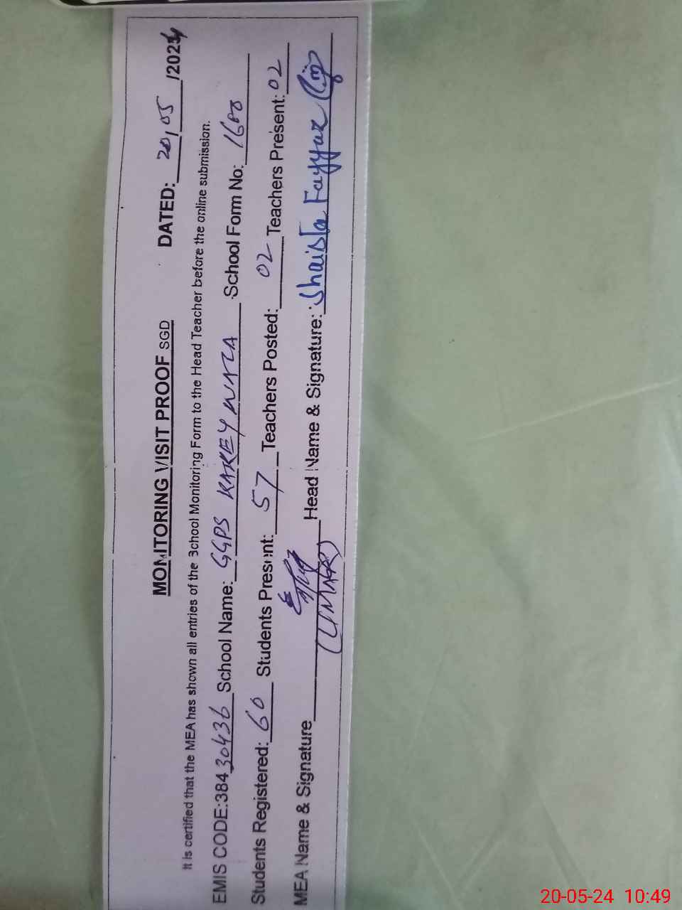 | Certified that this School was Inspected by the Undersigned MEA/DMO Today and the Information Stated Above is as Per Record. | |||||