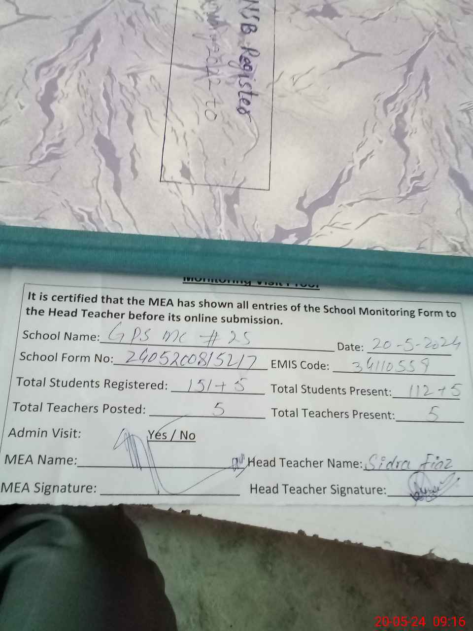 | Attendance Register | Head Teacher | MEA with School | Visit Proof |