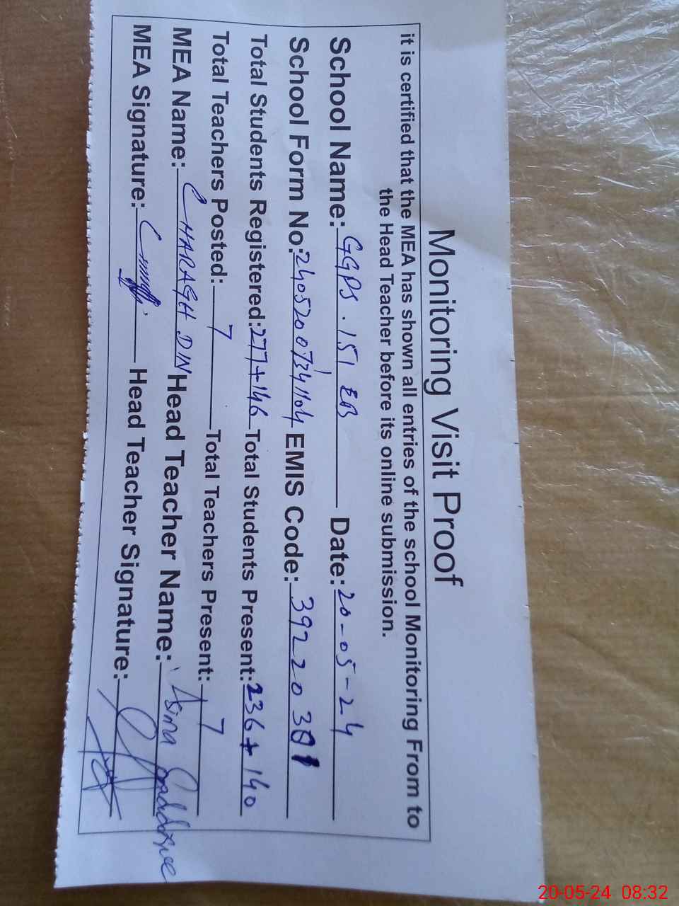 | Attendance Register | Head Teacher | MEA with School | Visit Proof |