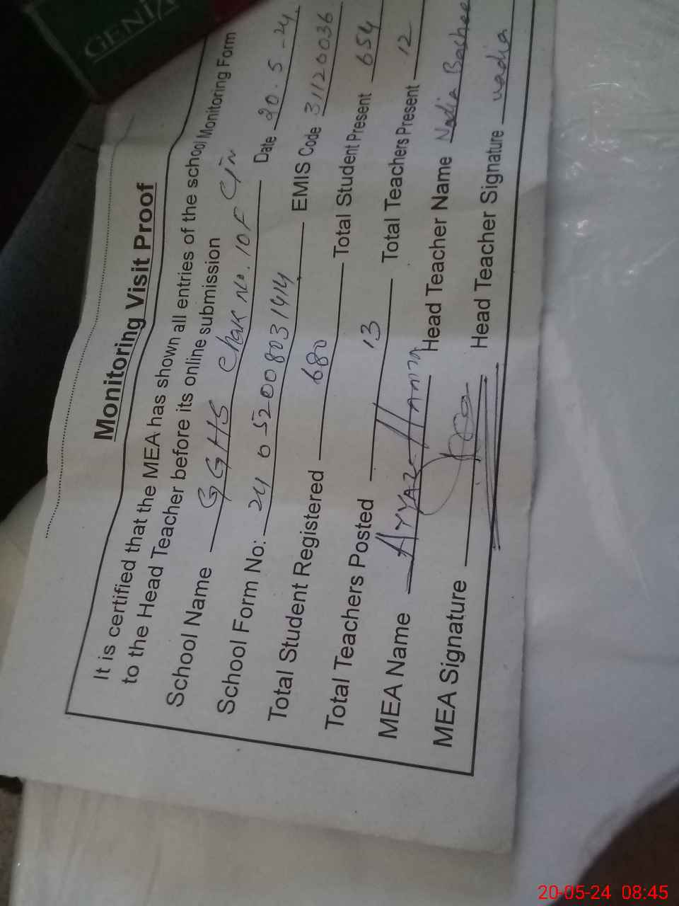 | Attendance Register | Head Teacher | MEA with School | Visit Proof |