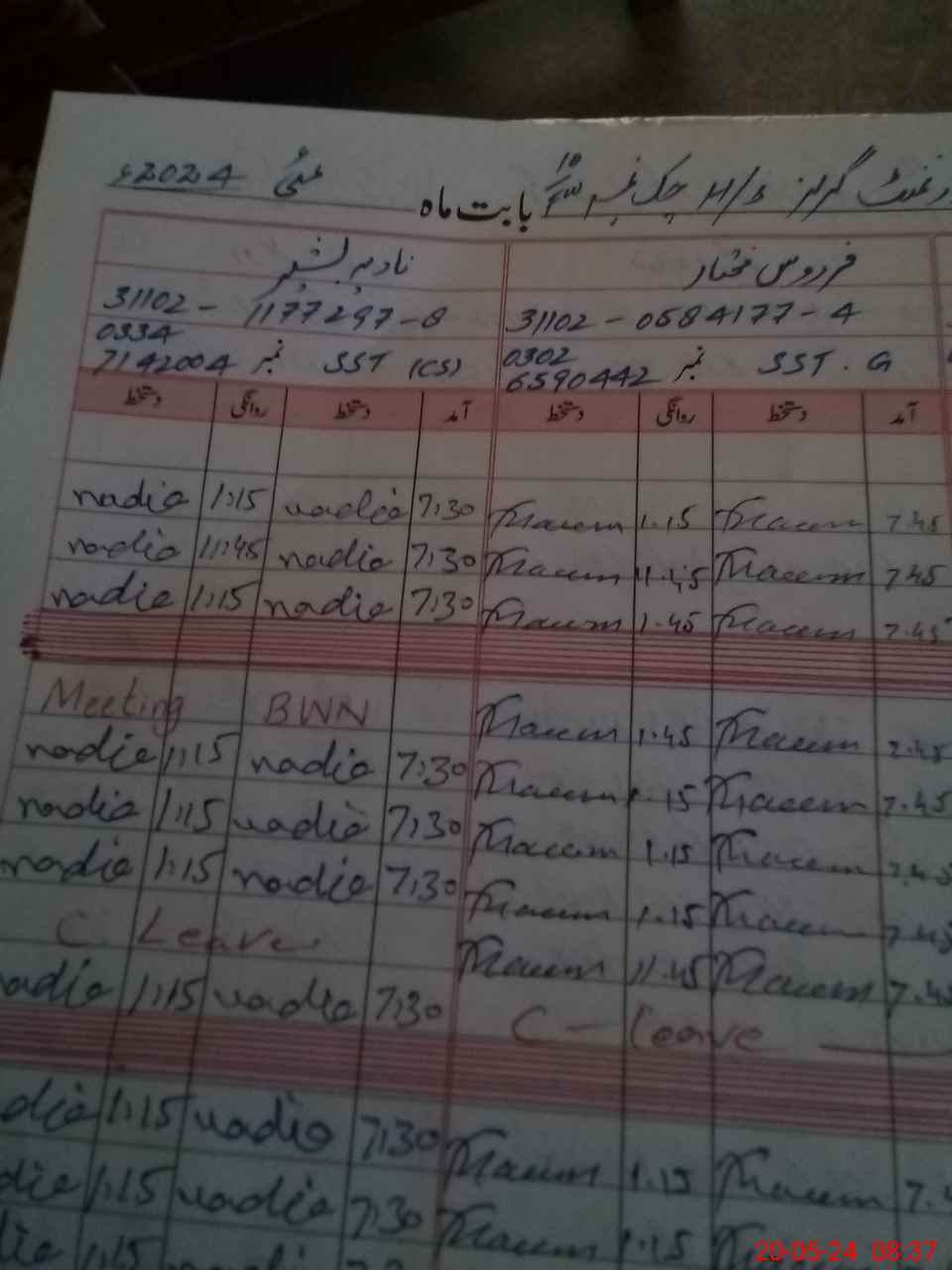 | CNIC | Full Name | Designation | R/C | Absence During Last Calender Month |