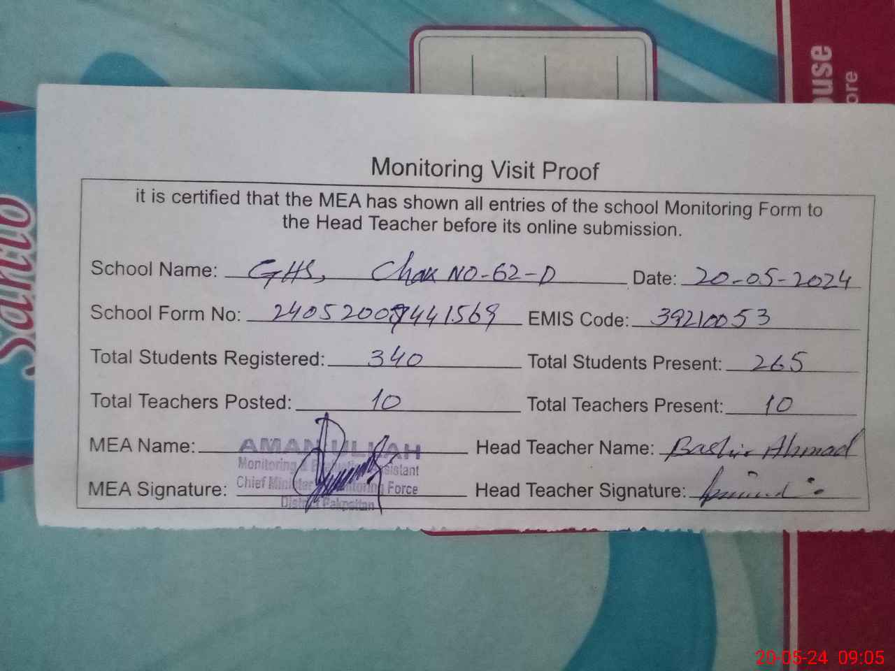 | Attendance Register | Head Teacher | MEA with School | Visit Proof |