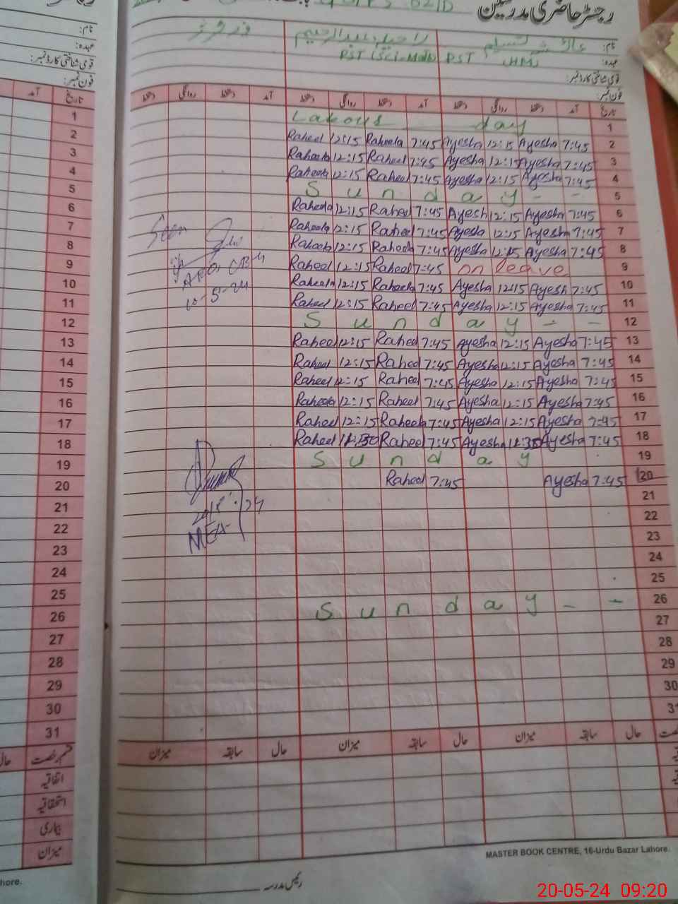 | CNIC | Full Name | Designation | R/C | Absence During Last Calender Month |